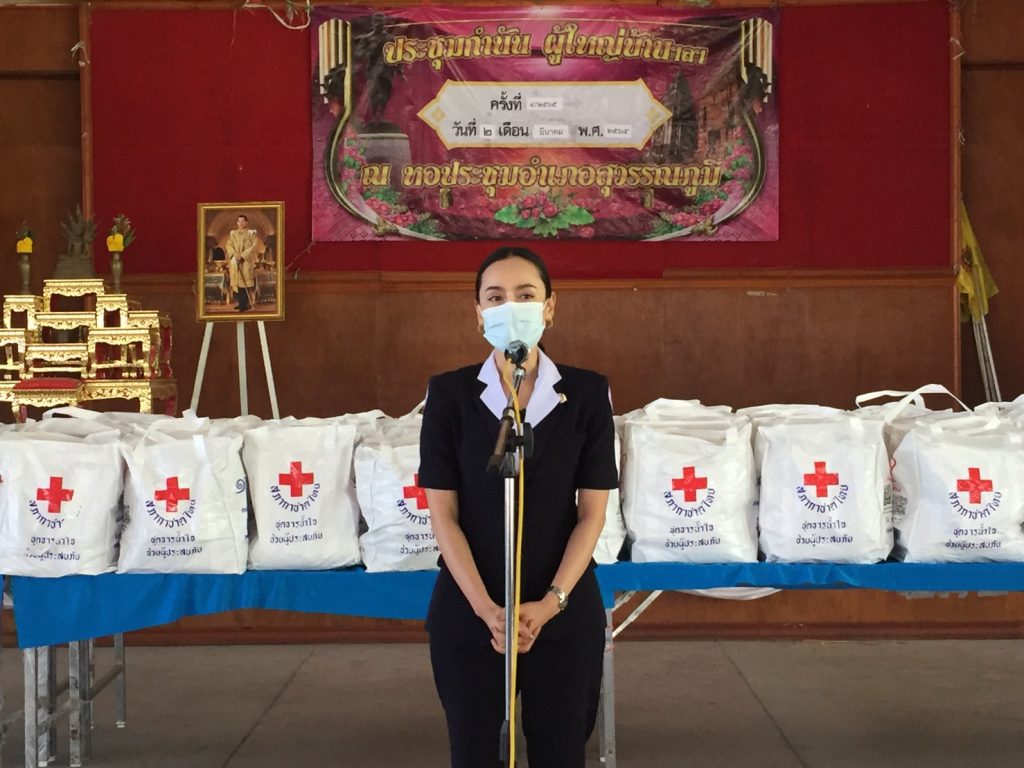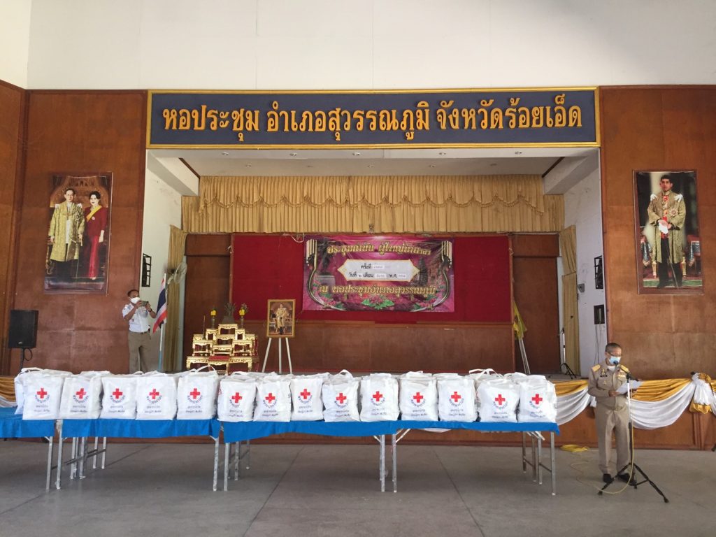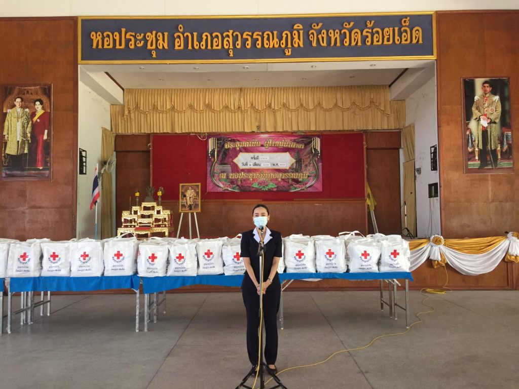 วันที่ 25 มีนาคม 2565 นางดนิตา สมจิตต์ นายกเหล่ากาชาดจังหวัดร้อยเอ็ด พร้อมด้วยคณะกรรมการเหล่ากาชาดจังหวัดร้อยเอ็ด ร่วมมอบถุงธารน้ำใจ สภากาชาดไทย ให้กับตัวแทนรับมอบจำนวนทั้งสิ้น 183 ชุด เพื่อมอบให้กับประชาชนที่ประสบวาตภัยในเขตพื้นที่อำเภอสุวรรณภูมิ จังหวัดร้อยเอ็ด ซึ่งบ้านเรือนราษฎรได้รับความเสียหาย จำนวน 2 ตำบล 5 หมู่บ้าน 183 ครัวเรือน ณ หอประชุมที่ว่าการอำเภอสุวรรณภูมิ จังหวัดร้อยเอ็ด