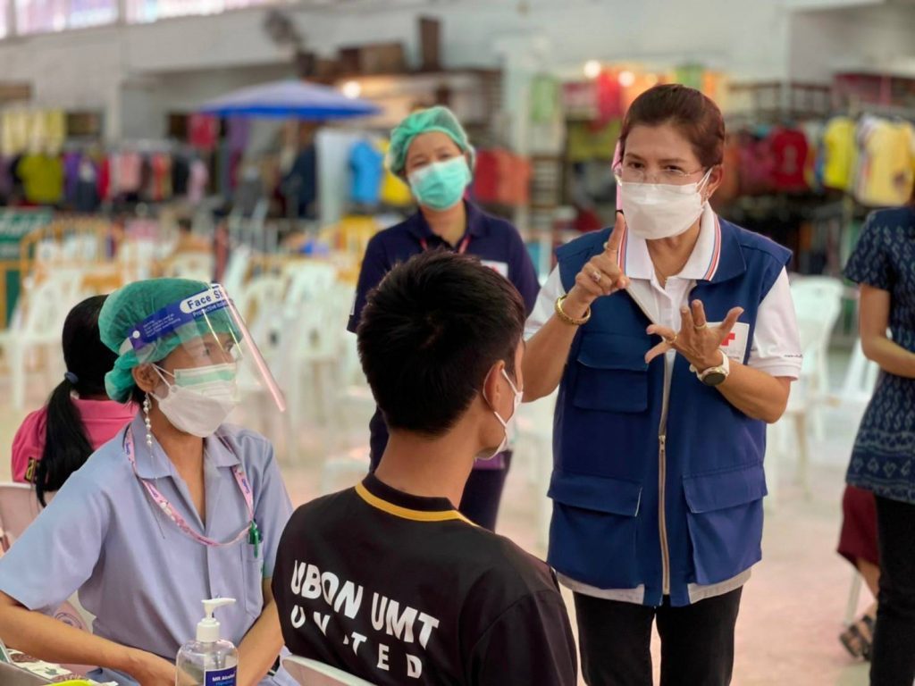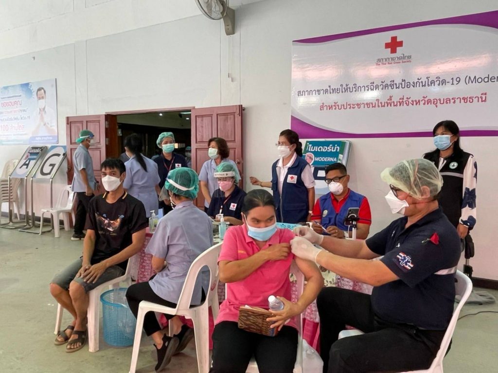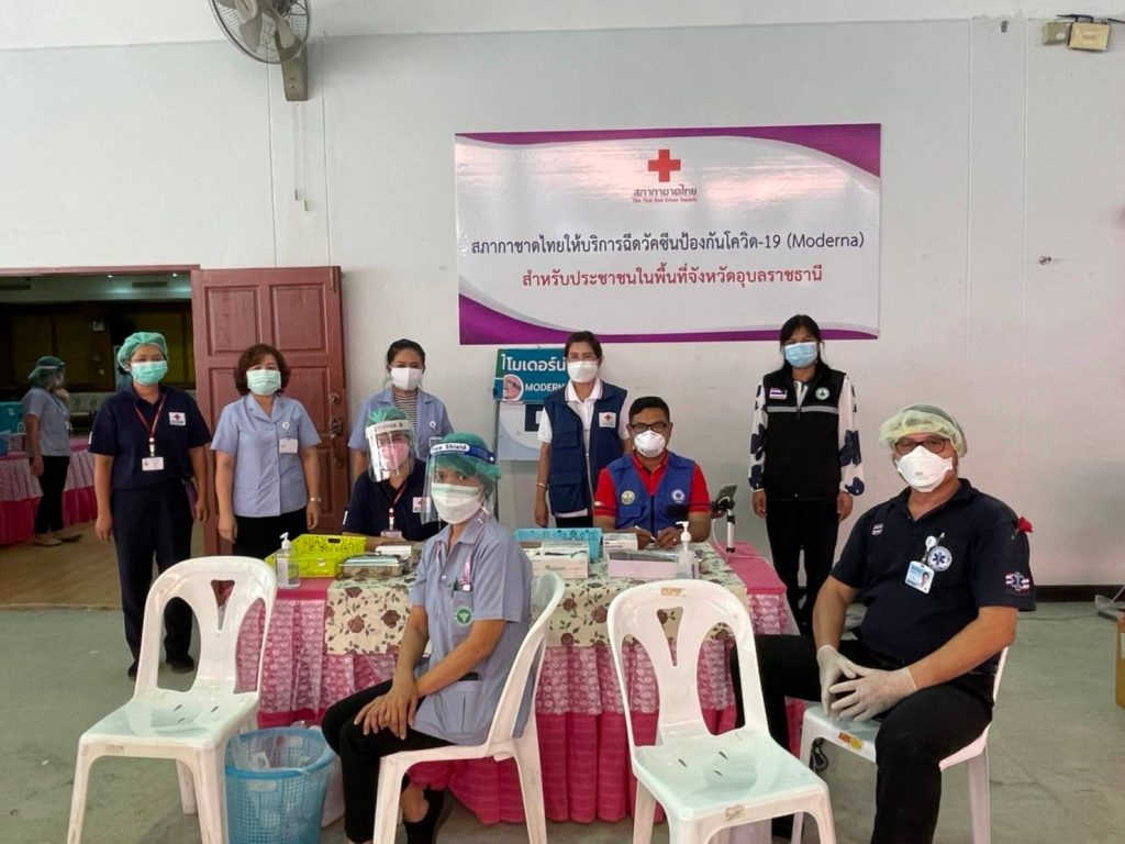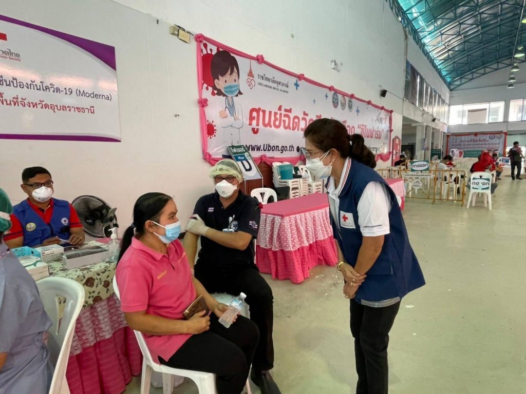 วันที่ 13 มกราคม 2565 นางศลิษา ภิรมย์รัตน์ นายกเหล่ากาชาดจังหวัดอุบลราชธานี พร้อมด้วยเจ้าหน้าที่เหล่ากาชาดจังหวัดอุบลราชธานี ลงพื้นที่เยี่ยมและให้กำลังใจ จุดฉีดวัคซีน Moderna ที่ได้รับการสนับสนุนจากสภากาชาดไทย และ Pfizer ป้องกันโรคติดเชื้อไวรัสโคโรนา 2019 (COVID – 19) โดยฉีดให้กับประชาชนที่ Walk in เข้ารับบริการตั้งแต่ 08.30-15.00 น. ณ ศูนย์โอท็อปเซ็นเตอร์ จังหวัดอุบลราชธานี และนายกเหล่ากาชาดจังหวัดอุบลราชธานี อำนวยความสะดวก จัดระเบียบการเข้าใช้บริการ พร้อมให้คำแนะนำในจุดบริการต่าง ๆ