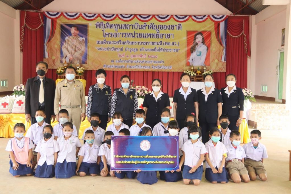 วันที่ 3 กุมภาพันธ์ 2565 นายสนิท ขาวสอาด ผู้ว่าราชการจังหวัดบึงกาฬ นายกเหล่ากาชาดจังหวัดบึงกาฬ มอบหมายให้ นางเฉลิมศรี บุญมาก รองนายกเหล่ากาชาดจังหวัดบึงกาฬ นางคำหมุน ยอดเทพ รองนายกเหล่ากาชาดจังหวัดบึงกาฬพร้อมด้วย หน่วยแพทย์อาสาสมเด็จพระศรีนครินทราบรมราชชนนี(พอ.สว.) หัวหน้าส่วนราชการ ข้าราชการ ประชาชน ร่วมโครงการ “ปกป้องและเชิดชูสถาบันพระมหากษัตริย์ และหน่วยบำบัดทุกข์ บำรุงสุข สร้างรอยยิ้มให้ประชาชนจังหวัดบึงกาฬ” ประจำปีงบประมาณ 2565 พร้อมทั้งมอบถุงยังชีพให้แก่ผู้ยากไร้ ผู้พิการ และผู้ด้อยโอกาส จำนวน 150 ราย ณ องค์การบริหารส่วนตำบลท่าดอกคำ อำเภอบึงโขงหลง จังหวัดบึงกาฬ โดยมีนายสนิท ขาวสอาด ผู้ว่าราชการจังหวัดบึงกาฬเป็นประธานในครั้งนี้ และลงพื้นที่เยี่ยมให้กำลังใจผู้ด้อยโอกาส ผู้พิการ และผู้ป่วยติดเตียง จำนวน 2 ราย1.นางปน นามสา อายุ 78 ปี ผู้ป่วยความดันโลหิตสูง แขนขาอ่อนแรง บ้านเลขที่ 10 หมู่ที่ 11 ตำบลท่าดอกคำ อำเภอบึงโขงหลง จังหวัดบึงกาฬ2. นางพลู วุฒิสาร อายุ 76 ปี ผู้ป่วยเบาหวาน ขา2ข้างอ่อนแรง เดินไม่ได้ หูไม่ไดยิน บ้านเลขที่ 40 หมู่ที่ 11 ตำบลท่าดอกคำ อำเภอบึงโขงหลง จังหวัดบึงกาฬ เหล่ากาชาดจังหวัดบึงกาฬได้มอบเครื่องอุปโภคบริโภคที่จำเป็นต่อการดำรงชีวิต รายละ 1 ชุด พัฒนาสังคมและความมั่นคงของมนุษย์จังหวัดบึงกาฬ มอบเงินช่วยเหลือ จำนวนรายละ 2,000 บาท พร้อมกันนี้โรงพยาบาลส่งเสริมสุขภาพประจำตำบลได้ร่วมเยี่ยมผู้ป่วยติดเตียงเพื่อตรวจติดตามสุขภาพให้กับผู้ป่วย
