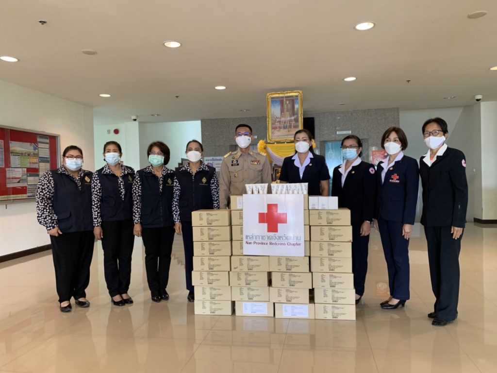 วันที่่ 24 มกราคม 2565 นางสุดารัตน์ แววบัณฑิต นายกเหล่ากาชาดจังหวัดน่าน พร้อมด้วยสมาชิกเหล่ากาชาดจังหวัดน่าน ชมรมแม่บ้านมหาดไทยจังหวัดน่าน มอบเจลแอลกอฮอล์แก่