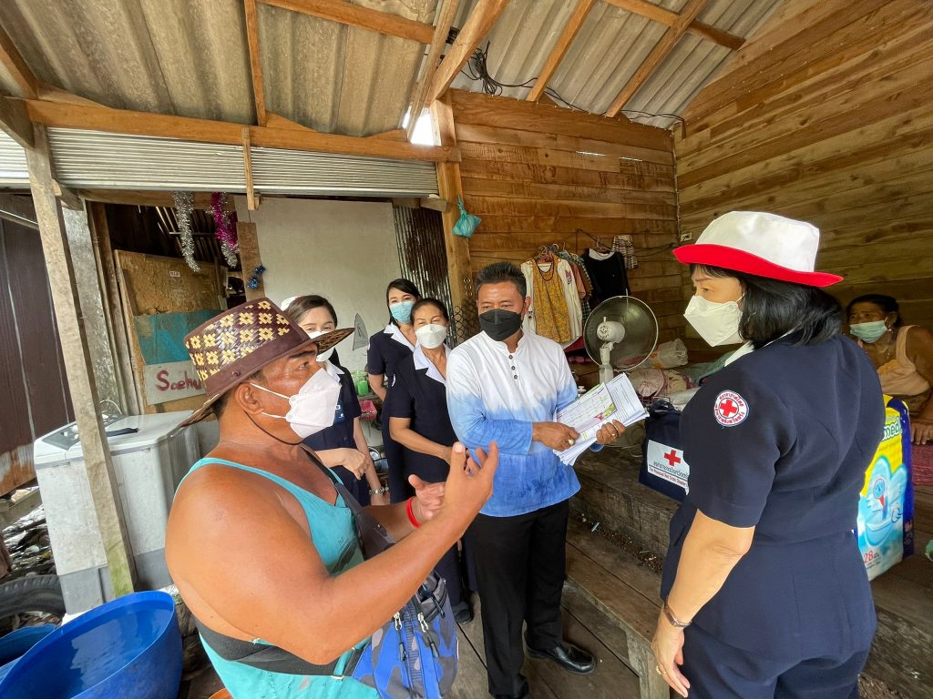 ในการนี้ เหล่ากาชาดจังหวัดตรังได้มอบชุดธารน้ำใจรายละ 2 ชุด มอบที่นอนลม เงินช่วยเหลือ และผ้าอ้อมสำเร็จรูป เพื่อช่วยเหลือเบื้องต้น