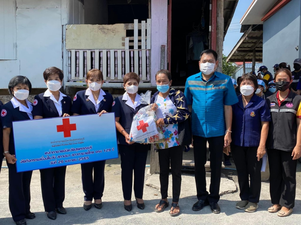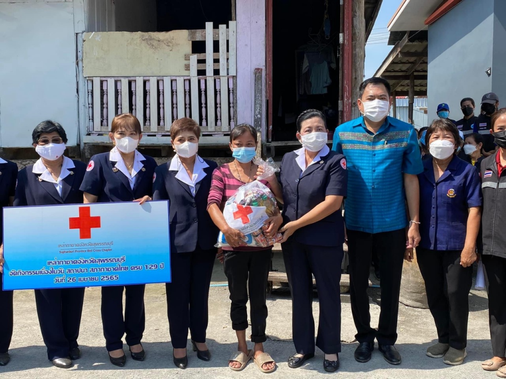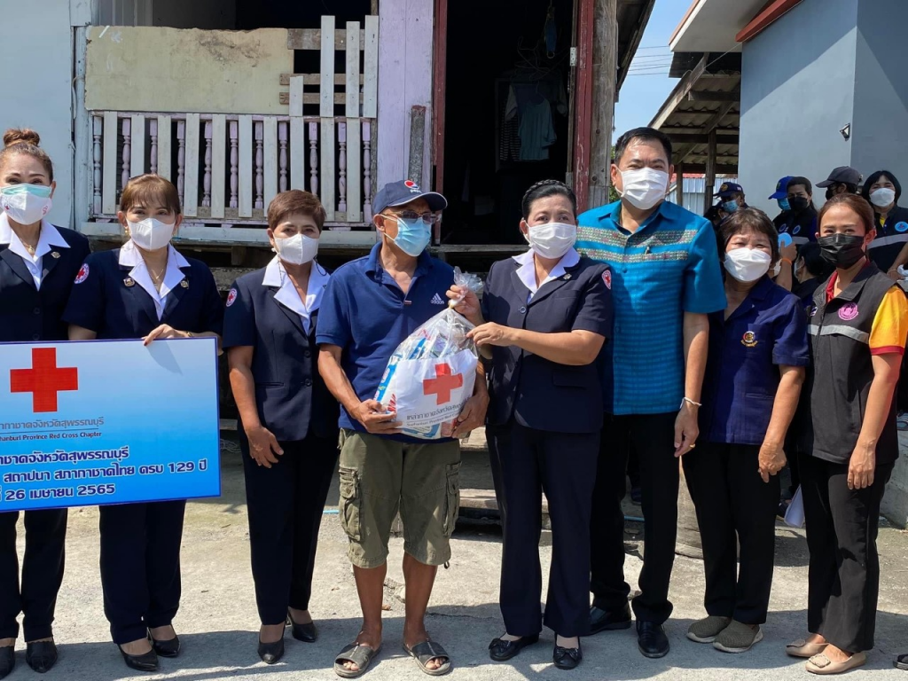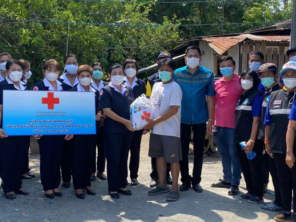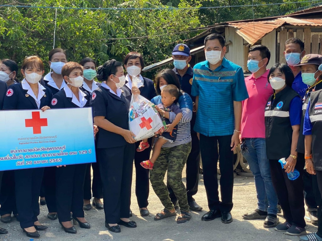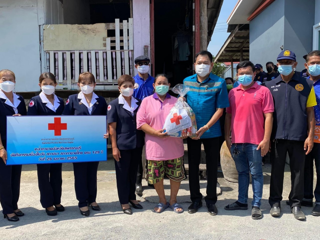 วันที่ 26 เมษายน 2565 นางนภัสสร สุวรรณประทีป นายกเหล่ากาชาดจังหวัดสุพรรณบุรี พร้อมด้วยที่ปรึกษา คณะกรรมการ และสมาชิกเหล่ากาชาดจังหวัด ลงพื้นที่เยี่ยมให้กำลังใจครัวเรือนยากจน ผู้ป่วย ผู้พิการ ตามโครงการขจัดความยากจนและพัฒนาคนทุกช่วงวัยอย่างยั่งยืน ตามหลักปรัชญาของเศรษฐกิจพอเพียง เนื่องในวันคล้ายวันสถาปนาสภากาชาดไทย ครบ 129 ปี โดยเหล่ากาชาดจังหวัดสุพรรณบุรี มอบเครื่องอุปโภค-บริโภค ให้แก่