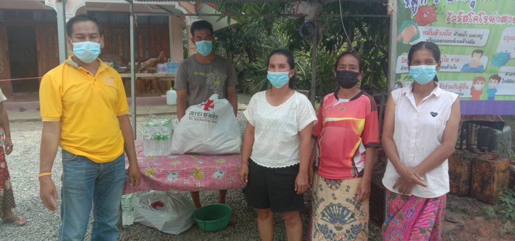 นายสมบูรณ์ เต็มชื่น นายอำเภอเขาชัยสน มอบตัวแทน กำนัน ผญบ. อสม. ตัวแทนรพ.สต. ฯลฯ นำชุดธารน้ำใจสภากาชาดไทยไปมอบให้