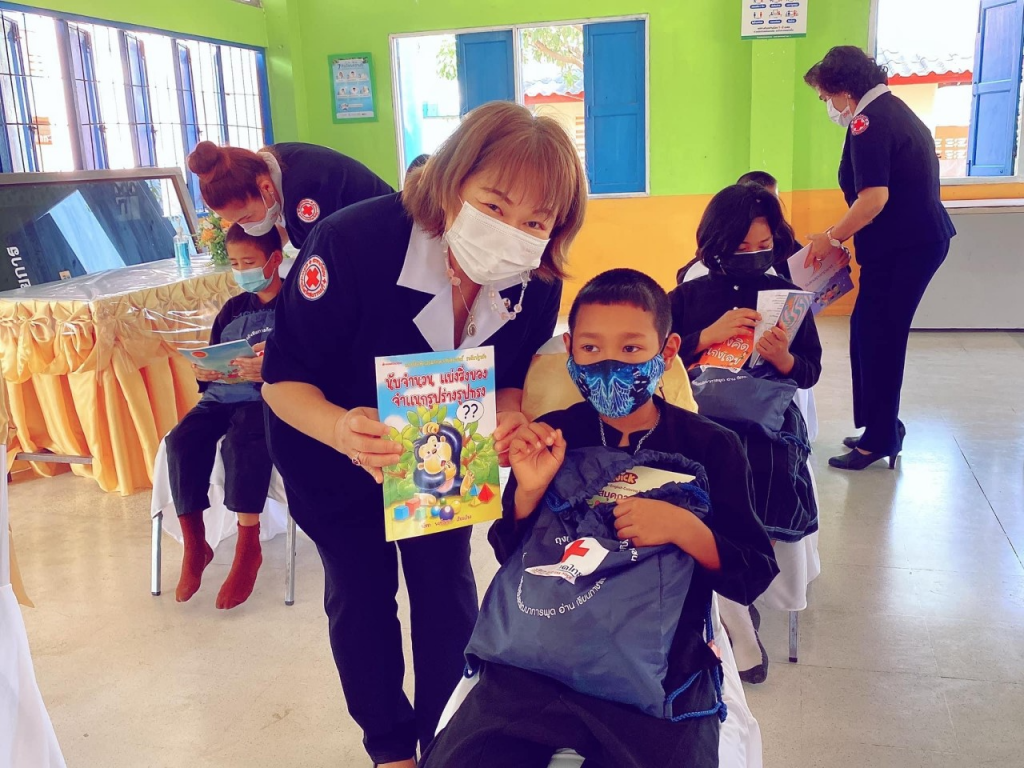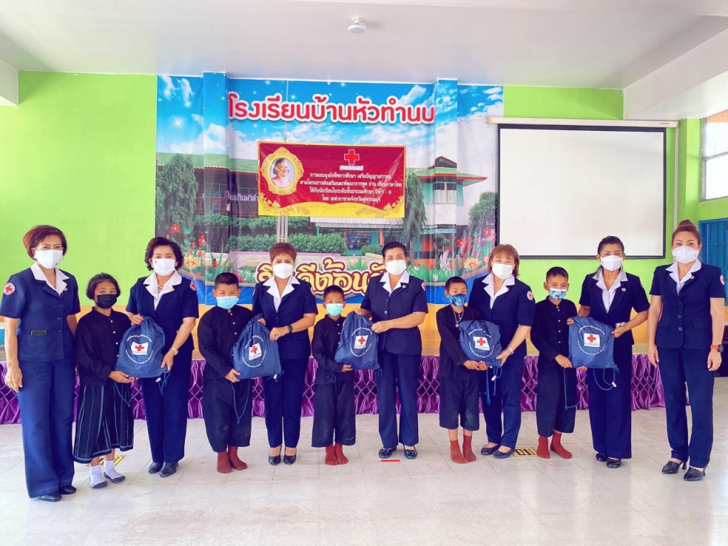 วันที่ 4 กุมภาพันธ์ 2565 นางนภัสสร สุวรรณประทีป นายกเหล่ากาชาดจังหวัดสุพรรณบุรี นางอัจฉราภรณ์ ถนอมกิตติ ที่ปรึกษาเหล่ากาชาดจังหวัด พร้อมด้วยกรรมการและสมาชิกเหล่ากาชาดจังหวัด ร่วมมอบถุงยังชีพการศึกษา เสริมปัญญาเยาวชน ตามโครงการส่งเสริมและพัฒนาการพูด อ่าน เขียนภาษาไทย ให้กับนักเรียนระดับประถมต้น ป.1 – ป.3 จำนวน 5 ราย และนักเรียนระดับประถมปลาย ป.4 – ป.6 จำนวน 5 ราย ณ โรงเรียนบ้านหัวทำนบ อ.อู่ทอง จ.สุพรรณบุรี