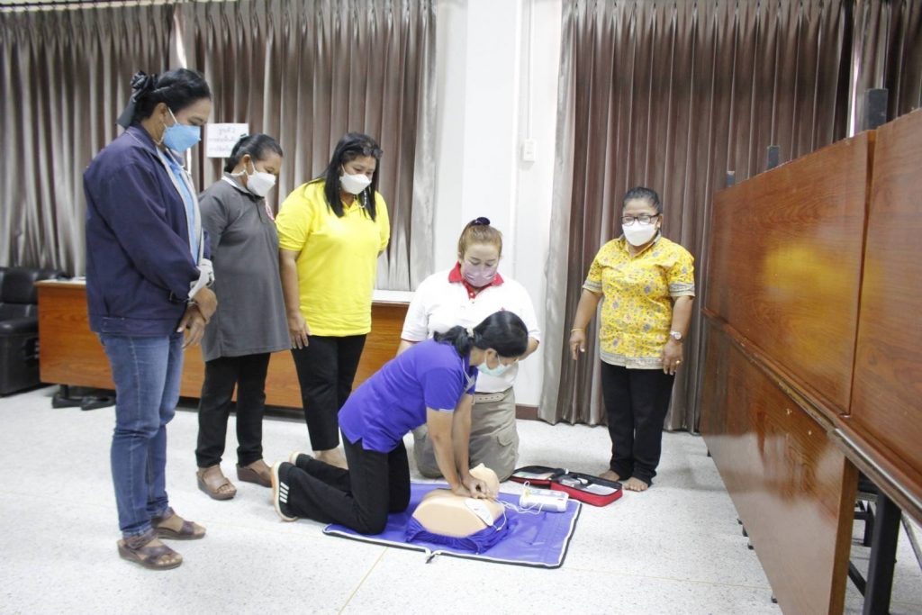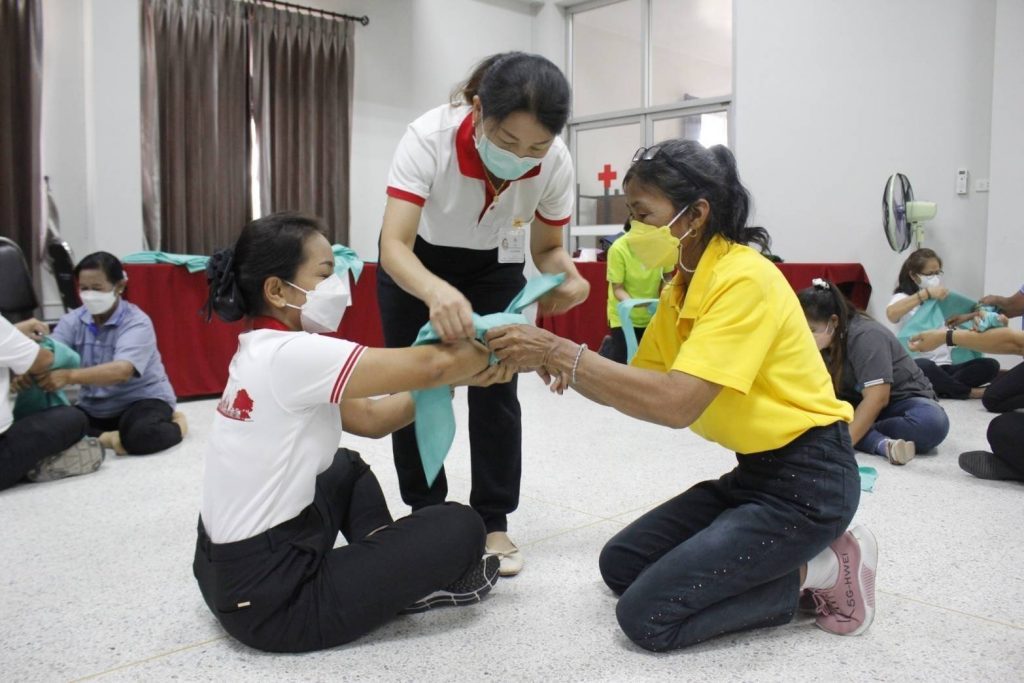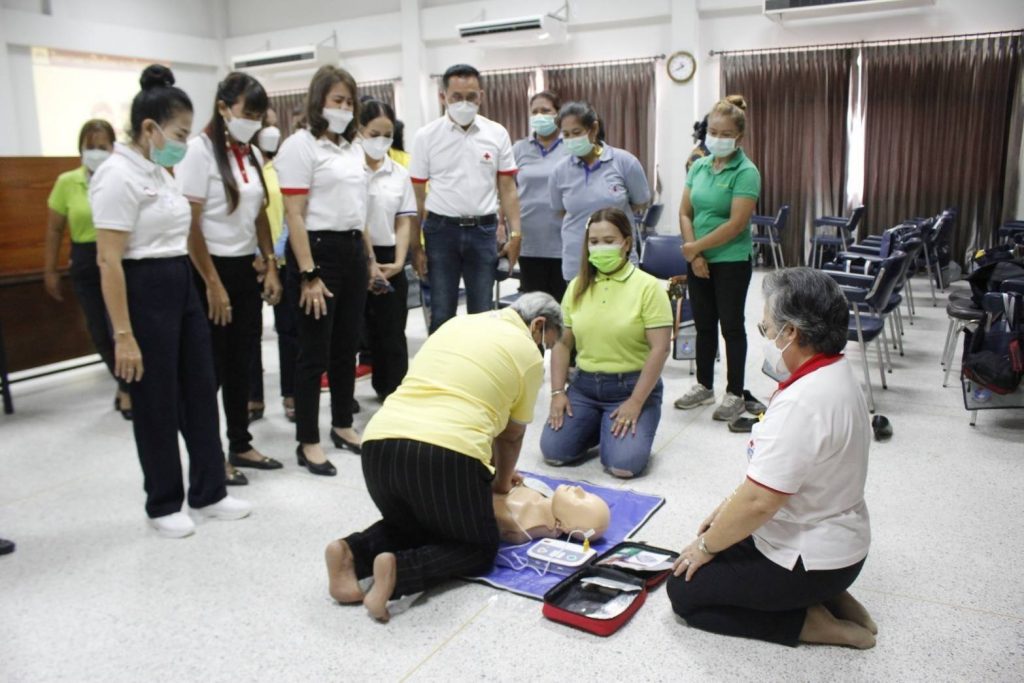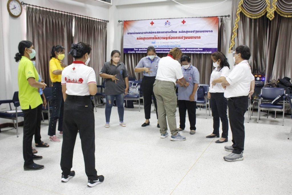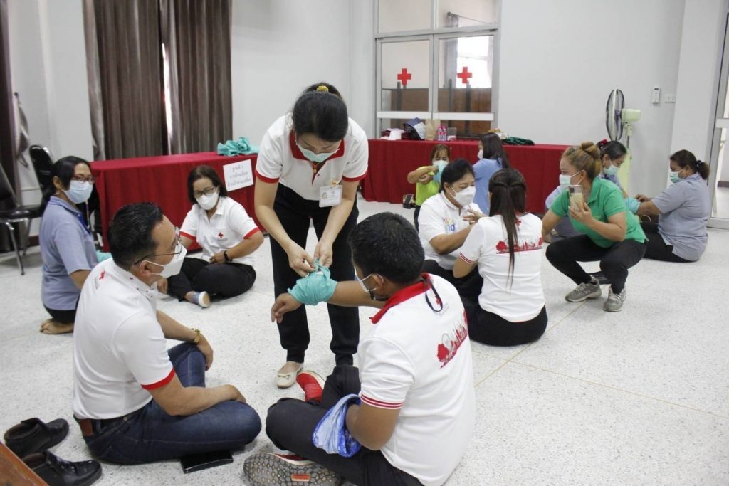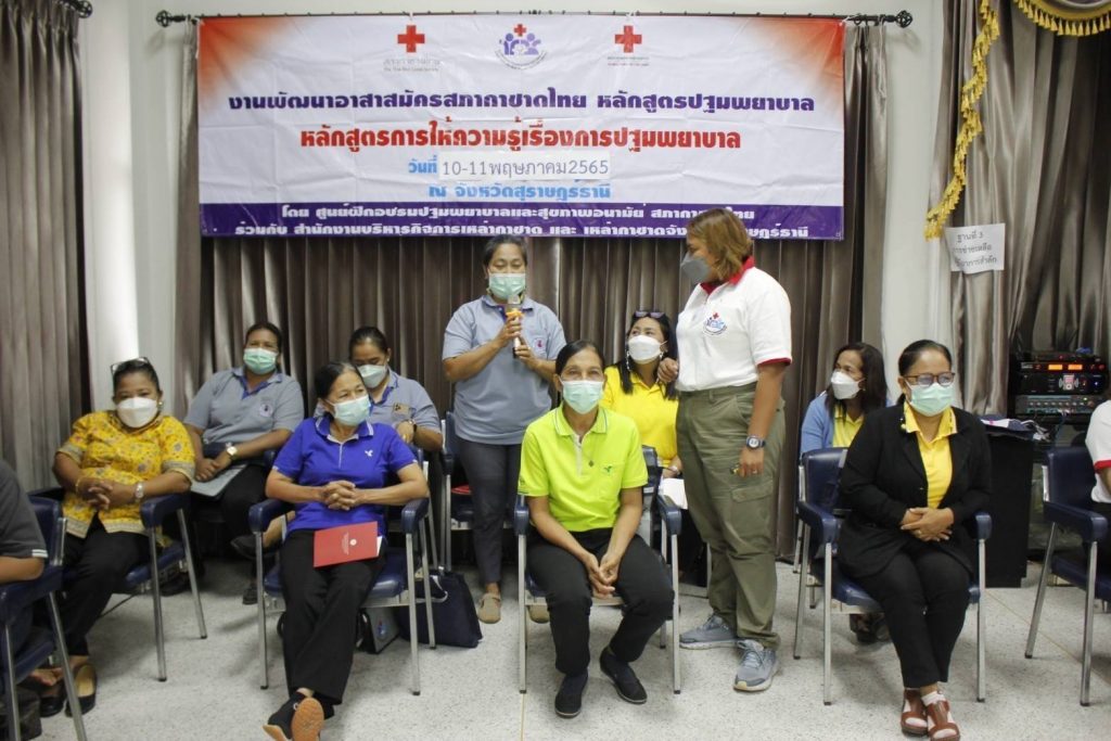 อำเภอเมือง จังหวัดสุราษฎร์ธานี โครงการพัฒนาอาสาสมัครสภากาชาดไทย หลักสูตรปฐมพยาบาล เพื่อฝึกอบรมอาสาสมัคร ให้ความรู้ เรื่องการปฐมพยาบาลและสร้างความเข้มแข็งให้แก่ประชาชน และอาสาสมัครในชุมชนของจังหวัดสุราษฎร์ธานี สามารถพึ่งตนเองได้ในเรื่องการปฐมพยาบาล โดยมุ่งหวังให้สามารถปฐมพยาบาลตนเอง ครอบครัวและสมาชิกในชุมชนได้อย่างปลอดภัย เมื่อเกิดอุบัติเหตุ โดยมี นางเพ็ญศรี สุขเขียว กรรมการเหล่ากาชาดจังหวัดสุราษฎร์ธานี เป็นผู้กล่าวรายงานฯ และวิทยากรจากศูนย์ฝึกอบรมปฐมพยาบาลและสุขภาพอนามัยสภากาชาดไทย สาธารณสุขอำเภอเมืองสุราษฎร์ธานีวิทยากรเครือข่ายสภากาชาดไทย ได้ฝึกอบรมและให้ความรู้ในครั้งนี้