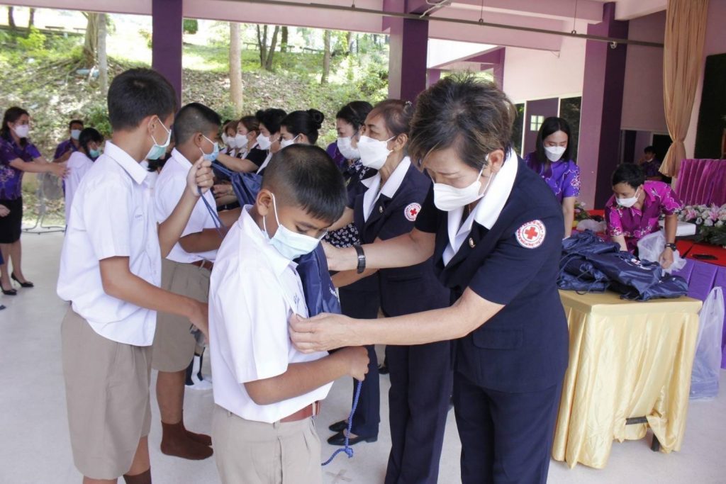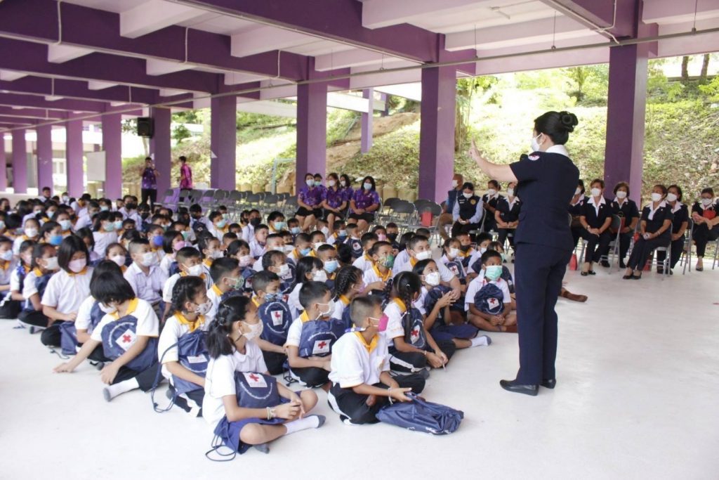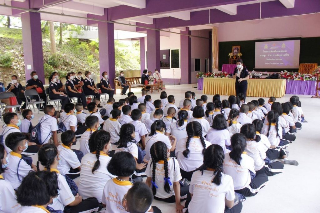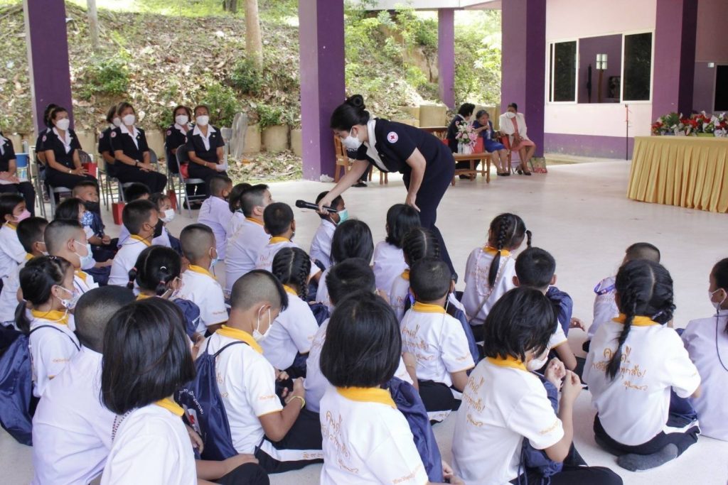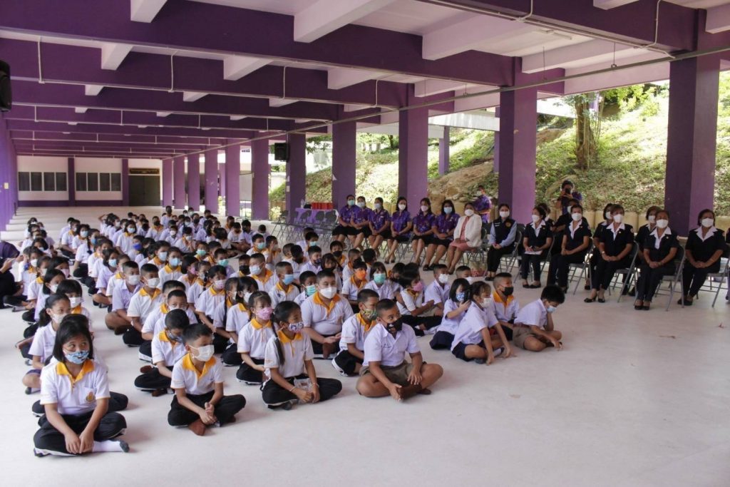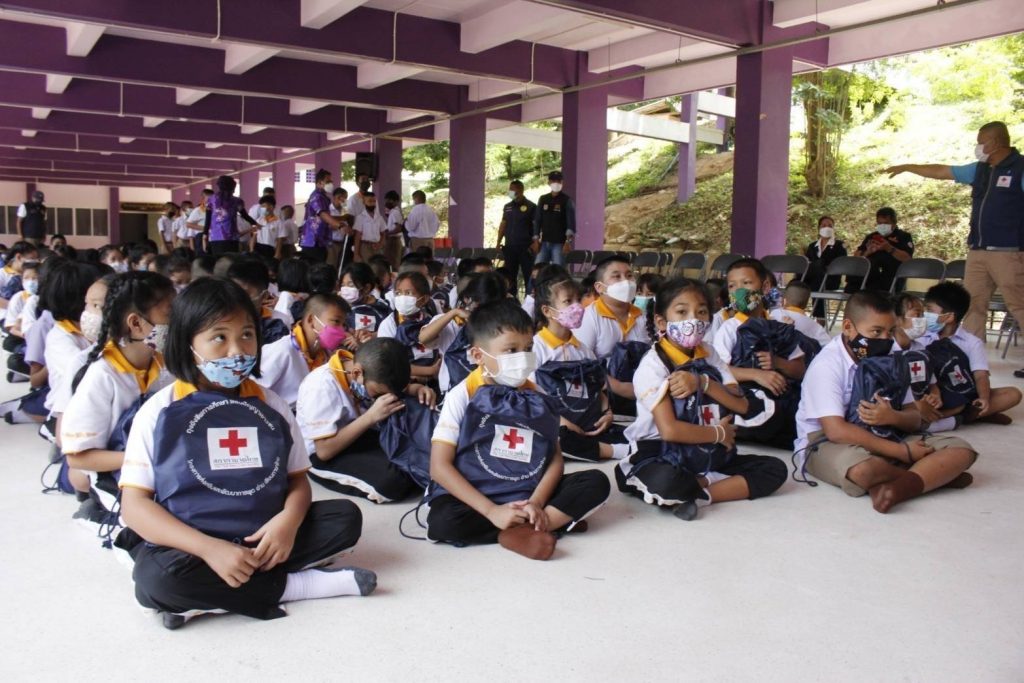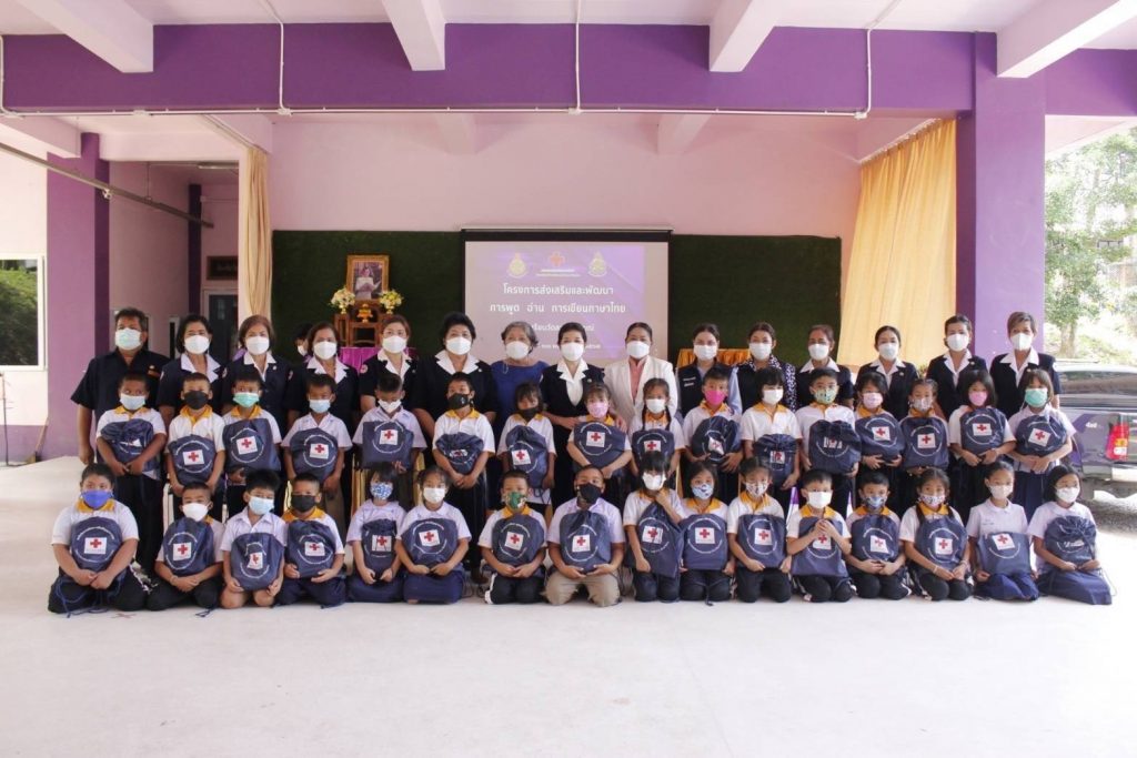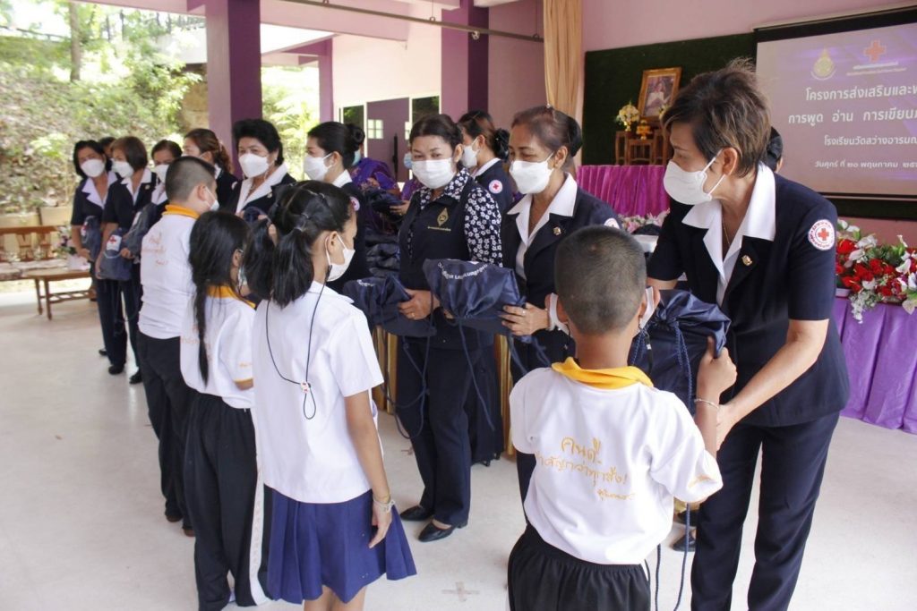 ในถิ่นทุรกันดาร ที่อ่านไม่ออก เขียนไม่ได้ โดยมอบ “ถุงยังชีพการศึกษา เสริมปัญญาเยาวชน” จำนวน 190 ถุง เพื่อมอบให้กับนักเรียน ระดับชั้นประถมศึกษาปีที่ 1-3 จำนวน 125 คน และระดับชั้นประถมศึกษาปีที่ 4-6 จำนวน 65 คน เพื่อเป็นการเสริมสร้างทักษะในการพูด อ่าน เขียนภาษาไทย และเสริมสร้างพัฒนาการด้านสุขภาพของเด็กนักเรียนต่อไป โดยมี นางถนอมศรี รัตนรักษ์ นายกกิ่งกาชาดอำเภอเกาะสมุย