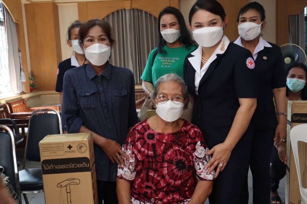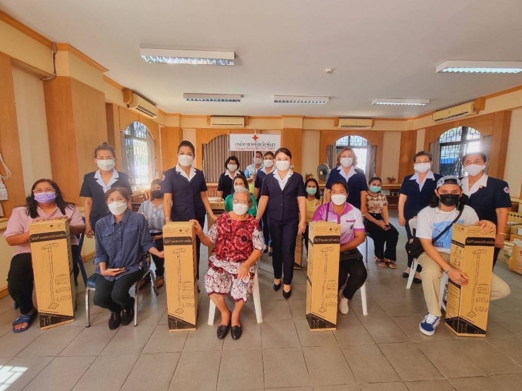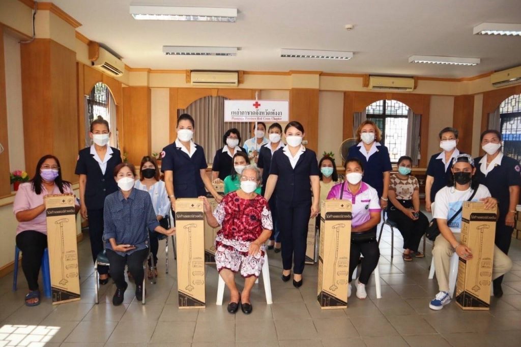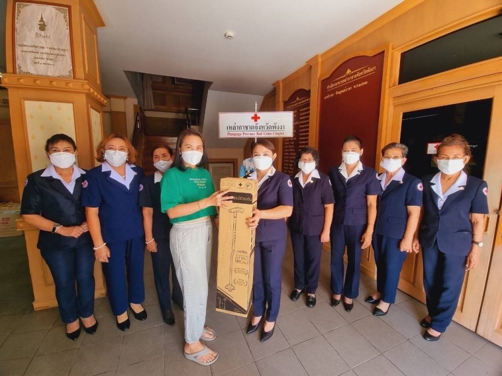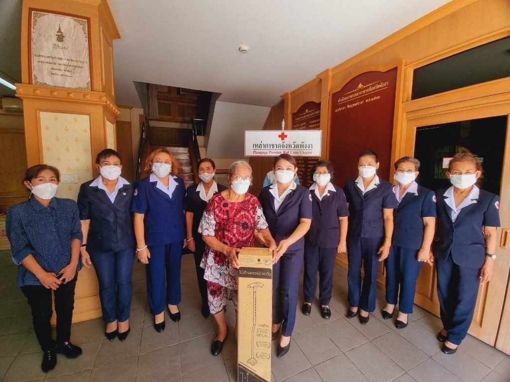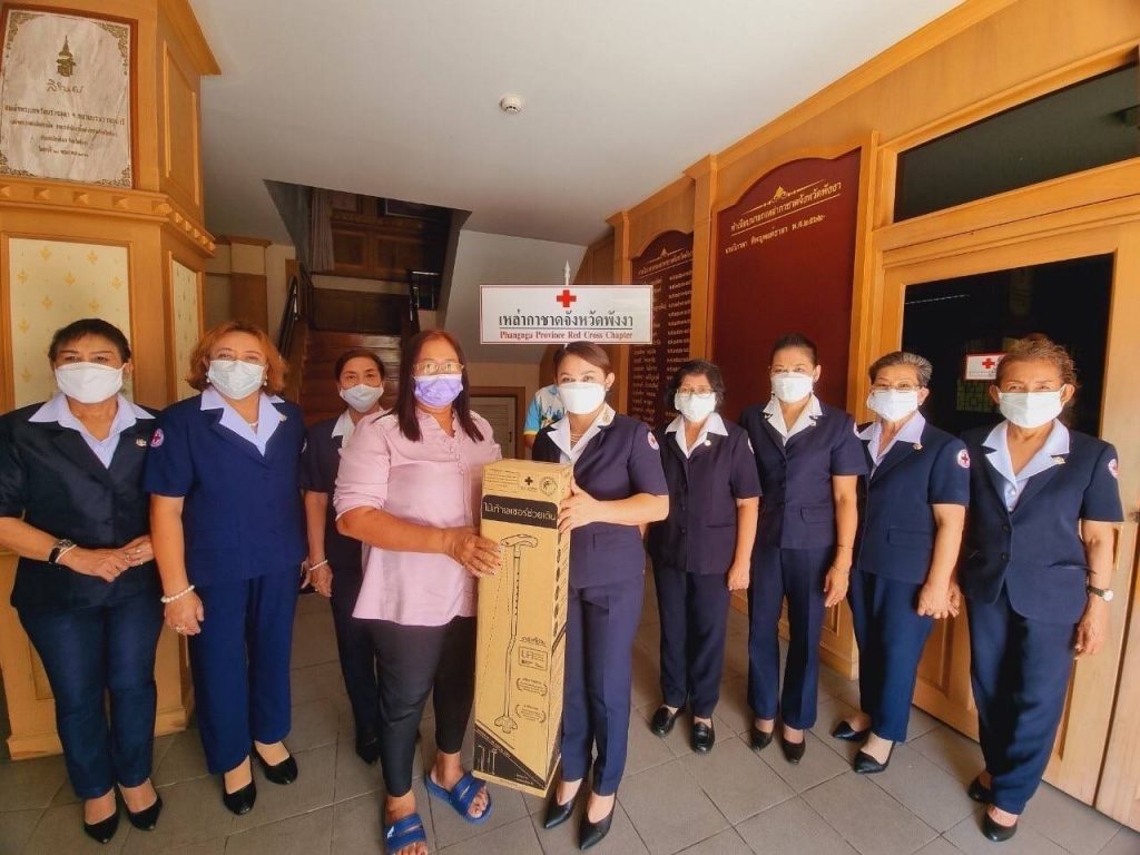 วันที่ 10 กุมภาพันธ์ 2565 นางวิภาดา ทิพญพงศ์ธาดา นายกเหล่ากาชาดจังหวัดพังงา พร้อมด้วยรองนายกเหล่ากาชาดจังหวัดพังงา กรรมการเหล่ากาชาดจังหวัดพังงา ส่งมอบ“ไม้เท้าเลเซอร์พระราชทาน”จากศูนย์ความเป็นเลิศทางการแพทย์โรคพาร์กินสันและกลุ่มโรค ความเคลื่อนไหวผิดปกติ โรงพยาบาลจุฬาลงกรณ์ สภากาชาดไทย ให้กับผู้ป่วยโรคพาร์กินสันจำนวน 8 ราย ที่มีอาการเดินติด ก้าวขาไม่ออก อุปกรณ์ทางการแพทย์ดังกล่าว จะช่วยลดปัญหาการเดินติดและเพิ่มความมั่นคงในการก้าวเดิน โดยใช้แสงเลเซอร์เป็นสิ่งชี้นำภายนอกเพื่อช่วยกระตุ้นให้ก้าวเดิน