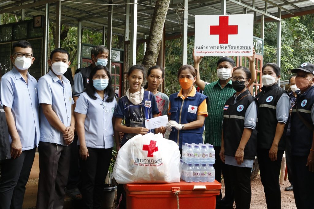 ผู้ยากไร้ รายที่ 62 ตามกิจกรรม “วันกาชาด บรรเทาทุกข์ บำรุงสุข ประชา ” ประจำปีปีงบประมาณ พ.ศ.2565 แก่ครอบครัว เด็กหญิงธิดา ไกยะฝ่าย อาศัยอยู่หมู่ 2 บ้านหนองนางด่อน ตำบลวังยาง อำเภอวังยาง จังหวัดนครพนม เป็นผู้พิการทางสมอง อาศัยอยู่กับตายายที่บ้าน 3 คน พ่อแม่แยกทางกัน สภาพบ้านทรุดโทรมไม่ปลอดภัย ต้องการให้ช่วยเหลือเรื่องทำบ้านให้แล้วเสร็จ เคยได้งบช่วยเหลือจาก พมจ. แต่ว่าบ้านยังไม่แล้วเสร็จ และต้องการความช่วยเหลือด้านอาชีพ โดยครอบครัวมีอาชีพรับจ้างกรีดยาและทำนา มีฐานะยากจน มีรายได้ไม่เพียงพอแก่การดำรงชีพ เหล่ากาชาดจังหวัดนครพนม มอบเงินช่วยเหลือ จำนวน 2,000 บาท พร้อมเครื่องอุปโภคบริโภค มูลค่า 2,000 บาท