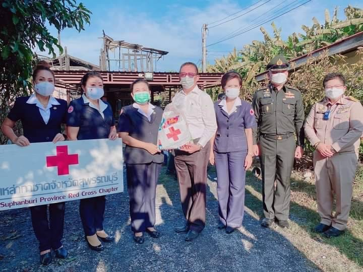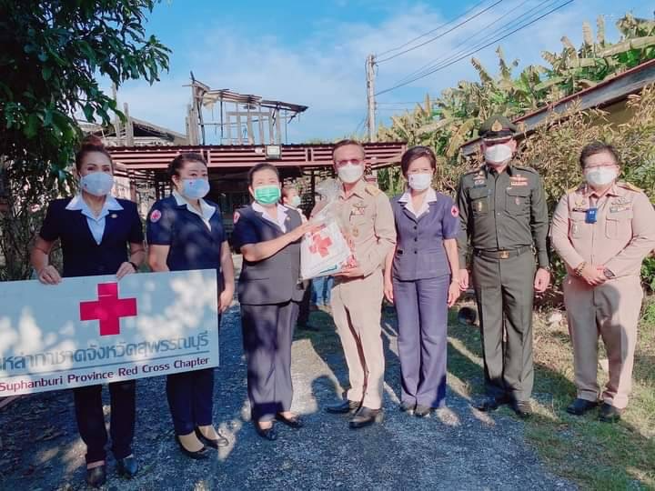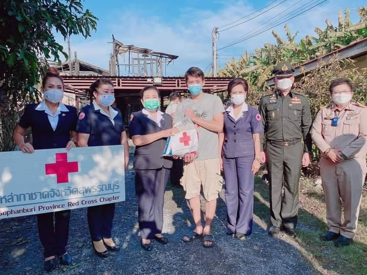 โดยเหล่ากาชาดจังหวัดสุพรรณบุรี มอบเครื่องอุปโภค-บริโภค รายละ 1 ชุด ณ ต.ท่าระหัด อ.เมืองสุพรรณบุรี จ.สุพรรณบุรี