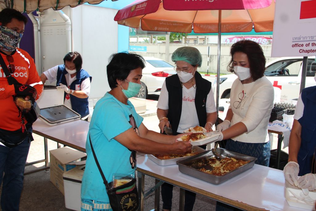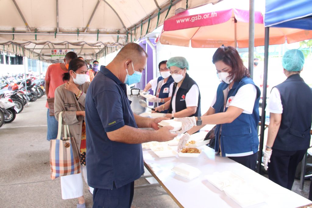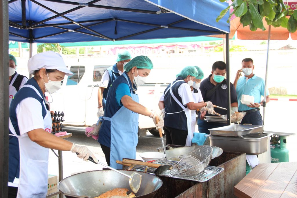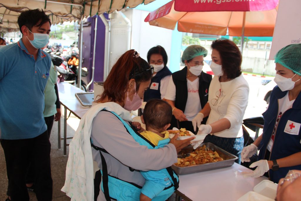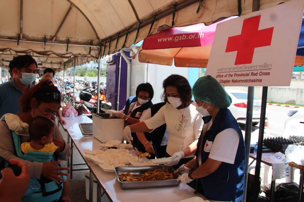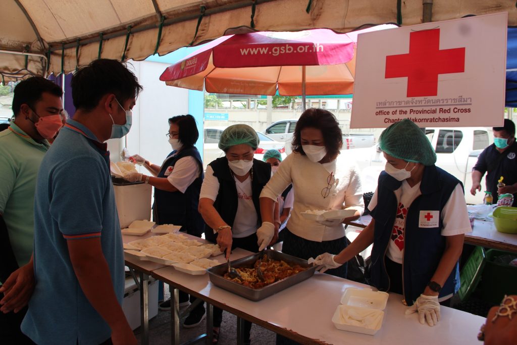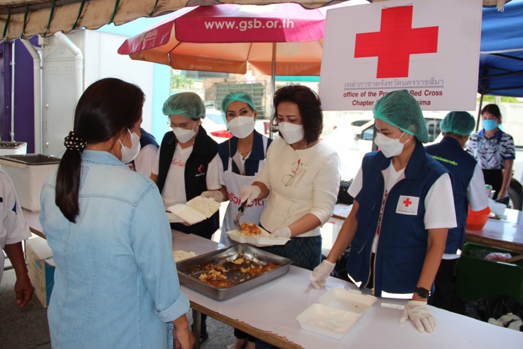 วันที่ 17 เมษายน 2565 นางณัฏฐินีภรณ์ จันทรโณทัย นายกเหล่ากาชาดจังหวัดนครราชสีมา พร้อมด้วย คณะกรรมการและสมาชิกเหล่ากาชาดจังหวัดนครราชสีมา ร่วมออกโรงทาน โดยทำข้าวไข่เจียว เพื่อให้บริการแก่ญาติผู้ป่วย และบุคลากรของโรงพยาบาลมหาราชนครราชสีมา