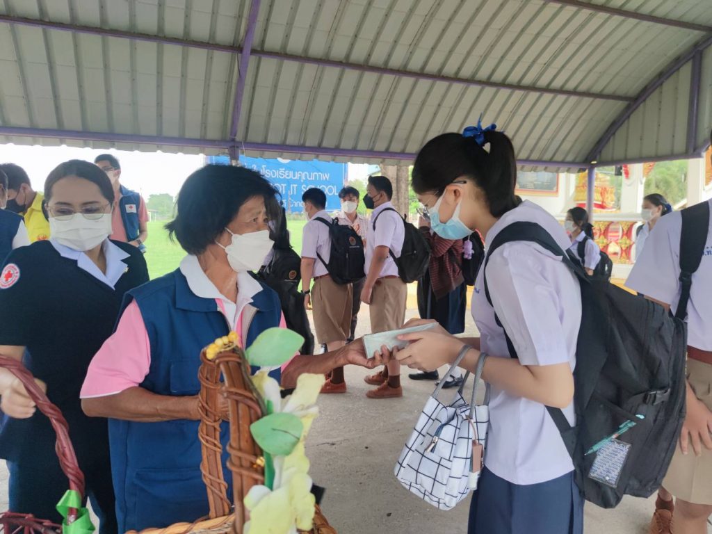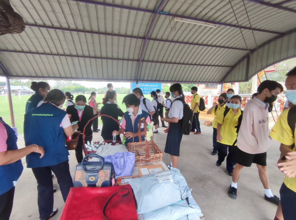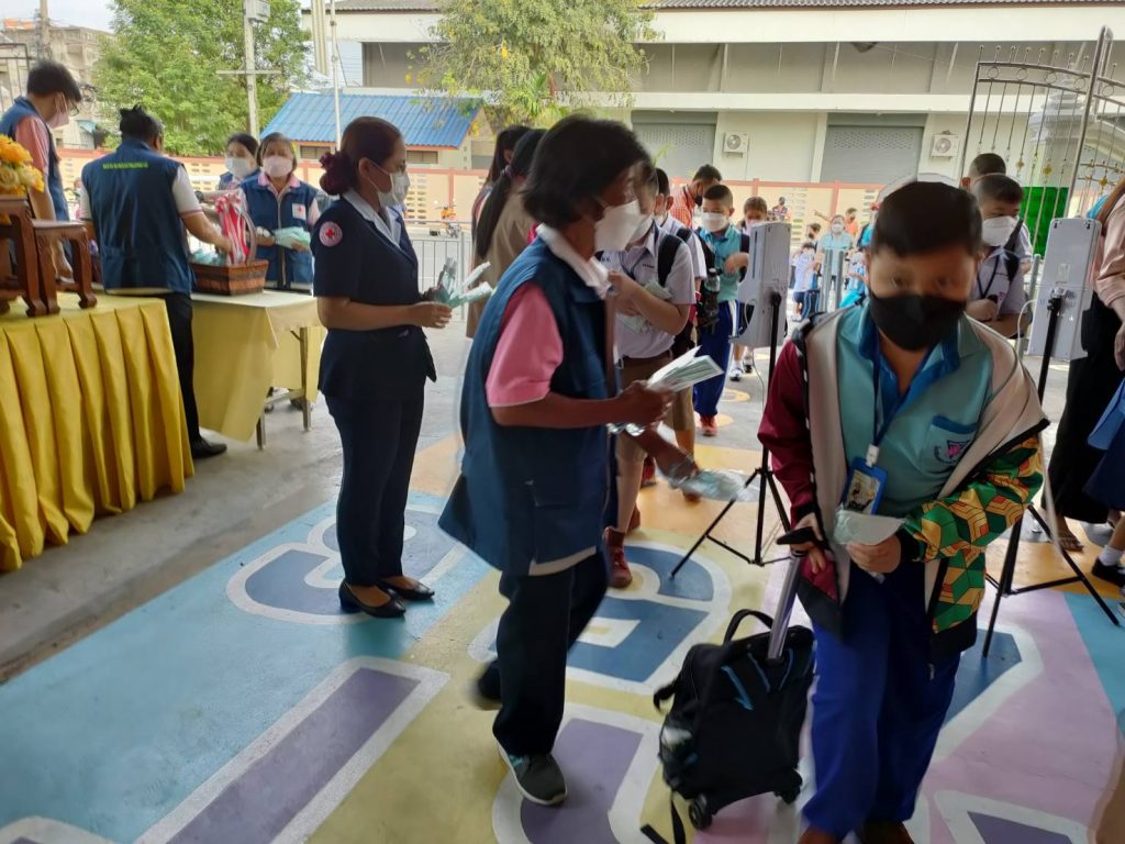 ลงพื้นที่แจกหน้ากากอนามัย และ แอลกอฮอล์ล้างมือ ปริมาณสุทธิ 100 ml. แก่เด็กนักเรียน ในวันเปิดภาคเรียน ปีการศึกษา 2565