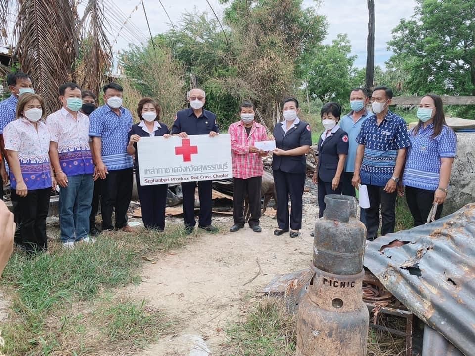 วันที่ 27 พฤษภาคม 2565 นางนภัสสร สุวรรณประทีป นายกเหล่ากาชาดจังหวัดสุพรรณบุรี พร้อมด้วยที่ปรึกษาและกรรมการเหล่ากาชาดจังหวัด เข้าเยี่ยมบรรเทาทุกข์ผู้ประสบอัคคีภัย ราย นายซ้อน ขันทองหล่อ โดยเหล่ากาชาดจังหวัดสุพรรณบุรี มอบเครื่องอุปโภค-บริโภค จำนวน 1 ชุด เงินบรรเทาทุกข์เบื้องต้น จำนวน 5,000 บาท น้ำดื่ม ขนาด 600 มิลลิลิตร จำนวน 1 แพ็ค กางเกงยีนส์ จำนวน 4 ตัว ณ บ้านเลขที่ 149 หมู่ที่ 8 ตำบลดอนเจดีย์ อำเภอดอนเจดีย์ จังหวัดสุพรรณบุรี
