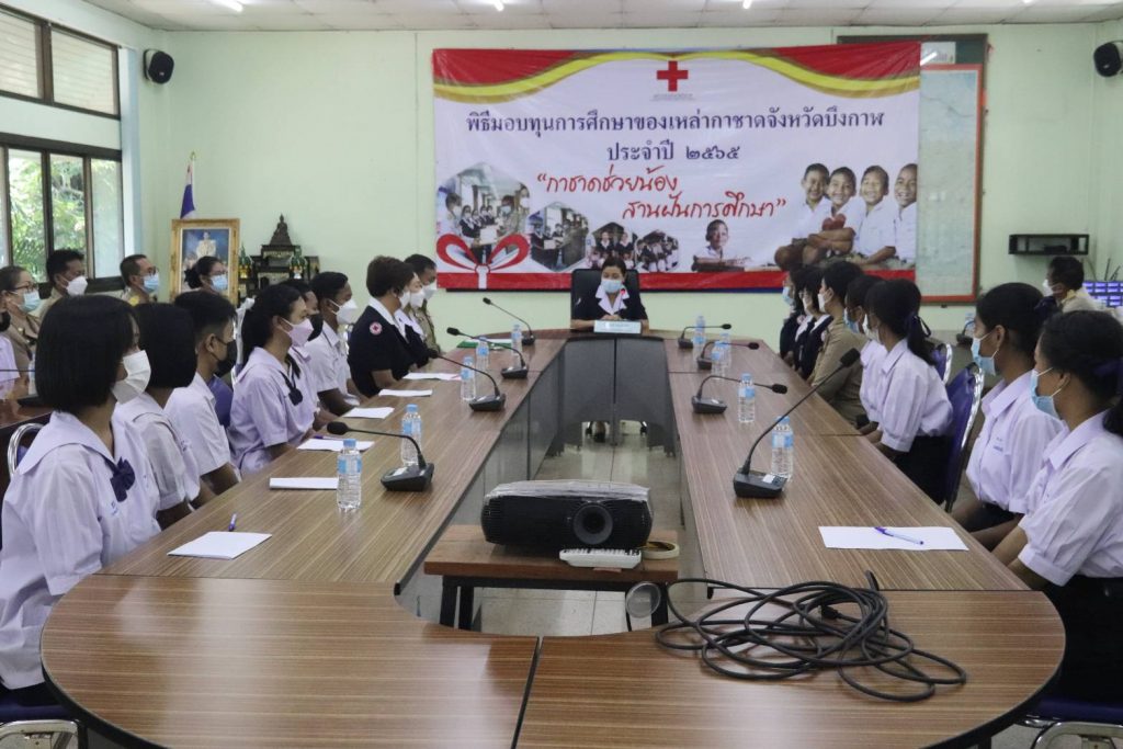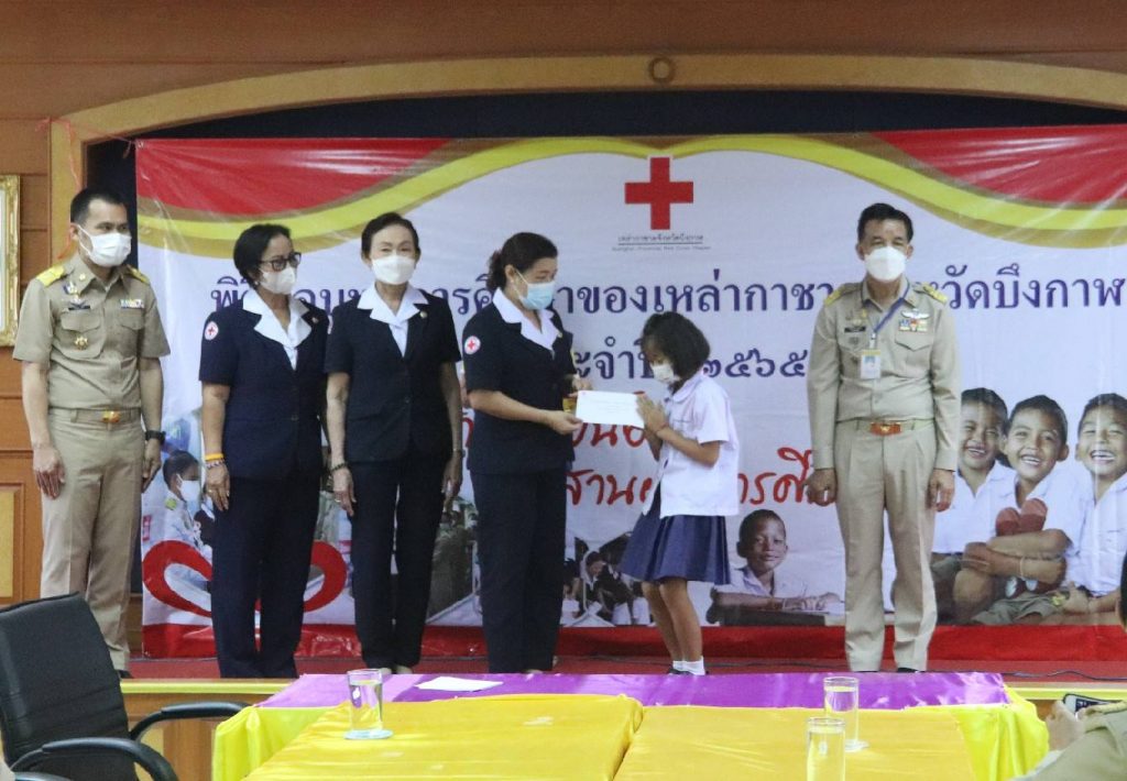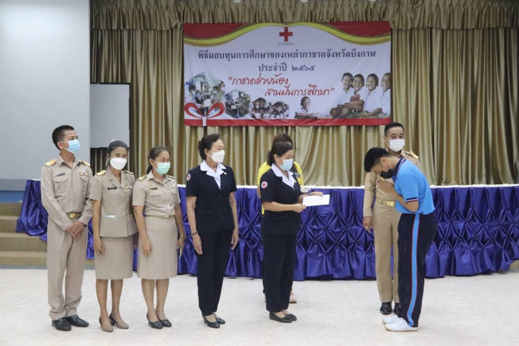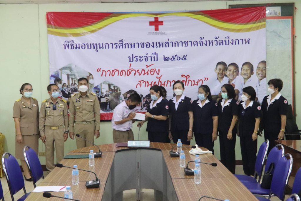 วันที่ 6 มิถุนายน 2565 นายสนิท ขาวสอาด ผู้ว่าราชการจังหวัดบึงกาฬ นายกเหล่ากาชาดจังหวัดบึงกาฬ มอบหมายให้ นางวาทิณี โฆษาศิวิไลซ์ รองนายกเหล่ากาชาดจังหวัดบึงกาฬ นางคำหมุน ยอดเทพ รองนายกเหล่ากาชาดจังหวัดบึงกาฬ ร่วมด้วย กรรมการและสมาชิกเหล่ากาชาดอำเภอศรีวิไล/อำเภอโซ่พิสัย/อำเภอเมืองบึงกาฬ นายโกเมณ ชาลี นายอำเภอศรีวิไล นายนายพงษ์พัฑฒ์ สินราย นายเภอโซ่พิสัย นายธีระพล ขุนพานเพิง นายอำเภอเมืองบึงกาฬ ผู้บริหารสถานศึกษา ครู อาจารย์ และนักเรียน มอบทุนการศึกษา ตามโครงการทุนการศึกษาเพื่อเด็กนักเรียนยากจนในจังหวัดบึงกาฬ ประจำปีงบประมาณ พ.ศ.2565 จำนวน อำเภอละ 20 ทุน แบ่งเป็น ประถมศึกษา จำนวน 10 ทุนๆละ 2,000 บาท มัธยมศึกษา จำนวน 10 ทุนๆละ 3,000 บาท ณ หอประชุมเทศบาลอำเภอศรีวิไล/หอประชุมอำเภอโซ่พิสัย/หอประชุมอำเภอเมืองบึงกาฬ