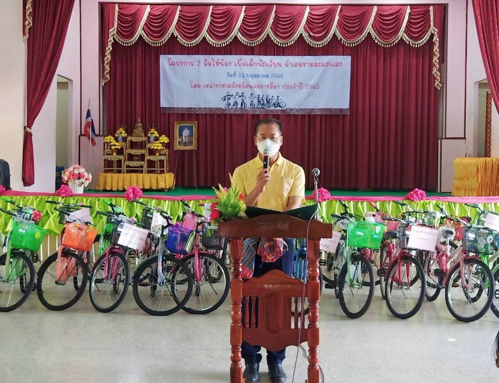 วันที่ 23 พฤษภาคม 2565 นายวิเชียร จันทรโณทัย ผู้ว่าราชการจังหวัดนครราชสีมา พร้อมด้วย นางณัฏฐินีภรณ์ จันทรโณทัย นายกเหล่ากาชาดจังหวัดนครราชสีมา ประธานพิธีเปิดโครงการ 2 ล้อ ให้น้อง เพื่อเด็กนักเรียนในชนบทของเหล่ากาชาดจังหวัด โดยมีคณะกรรมการและสมาชิกเหล่ากาชาดจังหวัดนครราชสีมา ร่วมในพิธี ณ หอประชุมโรงเรียนอนุบาลขามสะแกแสง อ.ขามสะแกแสง จ.นครราชสีมา