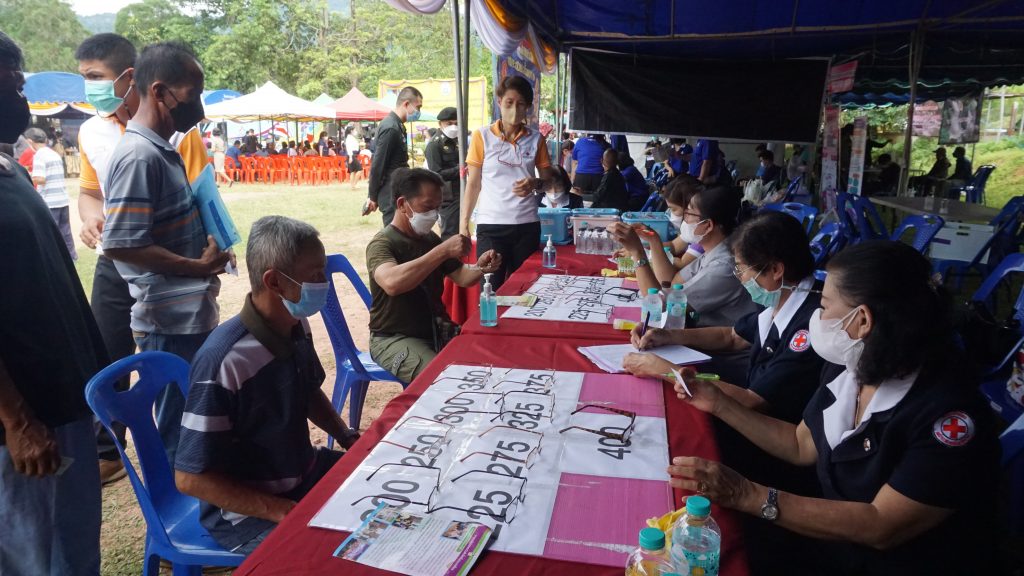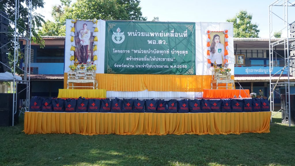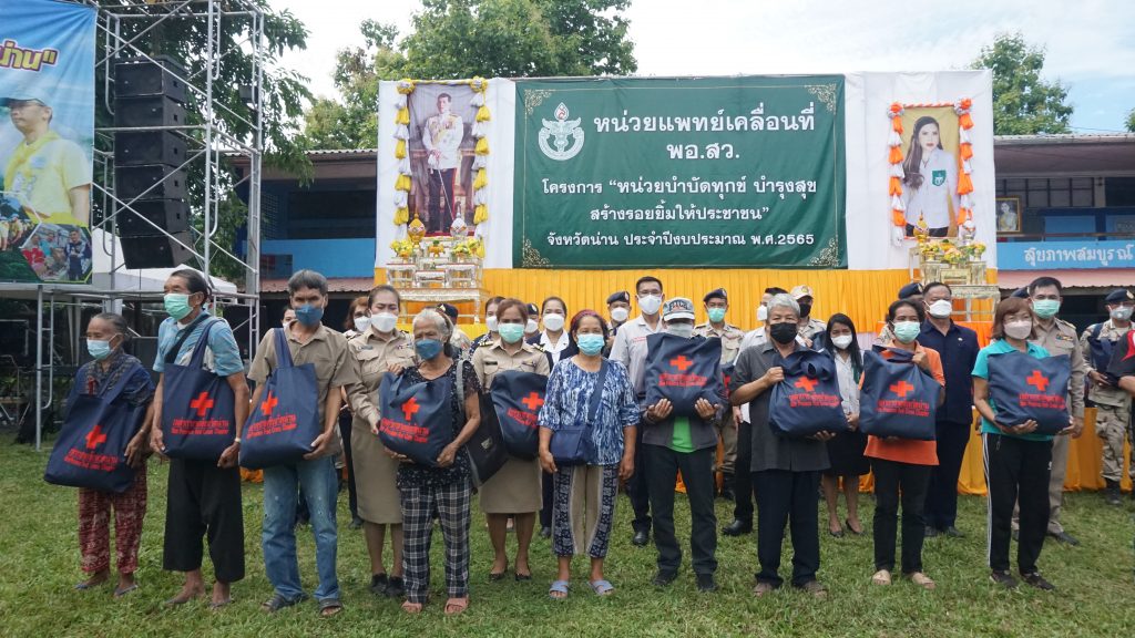 วันที่ 23 มิถุนายน 2565 นางสุดารัตน์ แววบัณฑิต นายกเหล่ากาชาดจังหวัดน่าน มอบหมายให้นางวาสิฎฐี ทวีสิงห์ รองนายกเหล่ากาชาดจังหวัดน่าน พร้อมด้วยกรรมการ สมาชิกเหล่ากาชาดจังหวัดน่าน ออกปฎิบัติงาน ร่วมกับหน่วยแพทย์เคลื่อนที่ พอ.สว.โครงการประจำปีงบประมาณ 2565 ณ โรงเรียนบ้านแม่ขะนิง ตำบลแม่ขะนิง อำเภอเวียงสาโดยมีนายวิบูรณ์ แววบัณฑิต ผู้ว่าราชการจังหวัดน่าน เป็นประธานเปิดโครงการและนำหน่วยงานราชการระดับจังหวัด อำเภอ ให้บริการประชาชนในพื้นที่เชิงรุก ในการนี้เหล่ากาชาดจังหวัดน่าน ได้นำถุงยังชีพมอบให้ผู้ยากไร้ จำนวน 50 ชุด และให้บริการแว่นสายตาสำหรับผู้สูงอายุ จำนวน 216 อันเวลา 13.00 น – 16.00 น คณะเหล่ากาชาดจังหวัดน่าน ร่วมกับ เจ้าหน้าที่สาธารณสุขจังหวัด เจ้าหน้าที่สาธารณสุขตำบลแม่ขะนิง โรงพยาบาลค่ายสุริยพงษ์ และเจ้าหน้าที่พัฒนาสังคมและความมั่นคงของมนุษย์จังหวัดน่านผู้นำท้องที่ ผู้บริหารท้องถิ่น ออกเยี่ยมและให้กำลังใจผู้ป่วย ผู้พิการ ในพื้นที่ ตำบลแม่ขะนิง อ.เวียงสา จำนวน 3 ราย พร้อมมอบถุงยังชีพ และสิ่งของใช้ที่จำเป็น จำนวน 3 ชุด