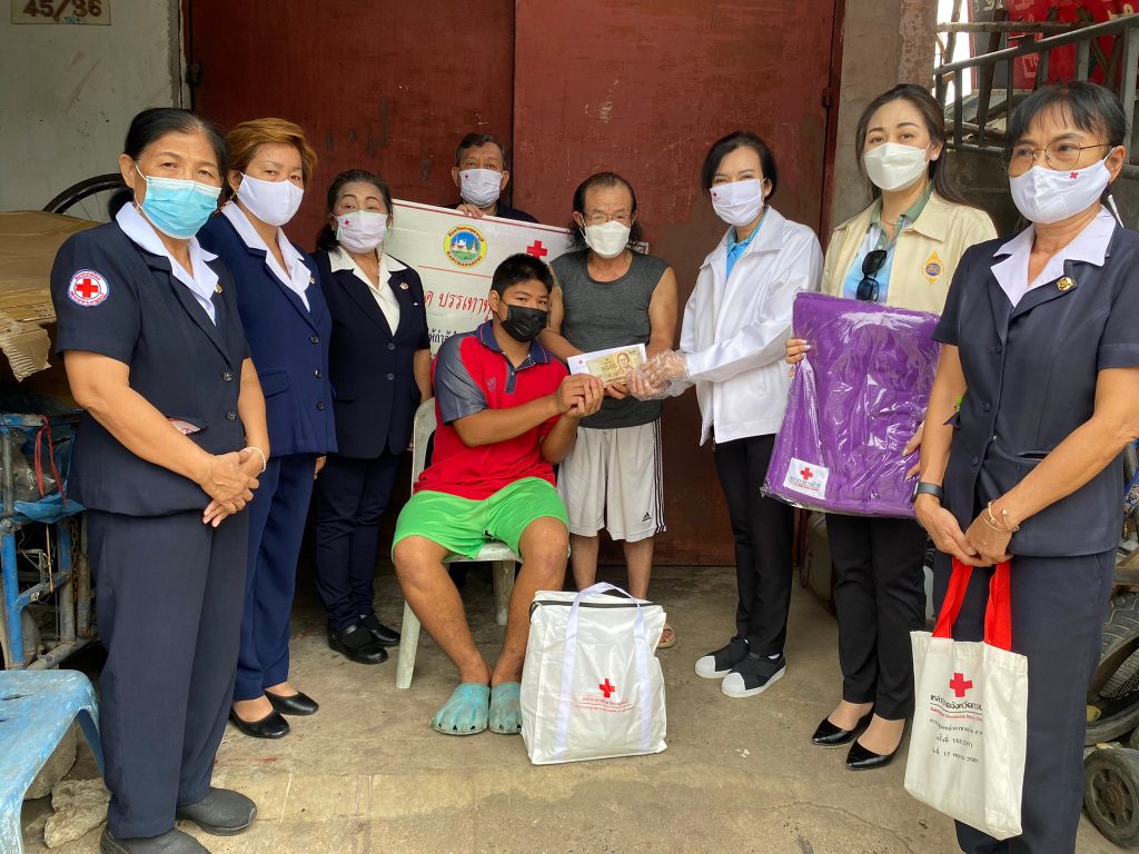 โดยเหล่ากาชาดจังหวัดกาญจนบุรี ได้มอบเครื่องอุปโภค – บริโภค จำนวน 6 ชุด ผ้าห่ม 6 ผืน และเงินช่วยเหลือเบื้องต้น รายละ 5,000 บาท