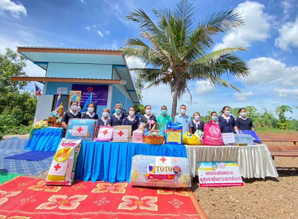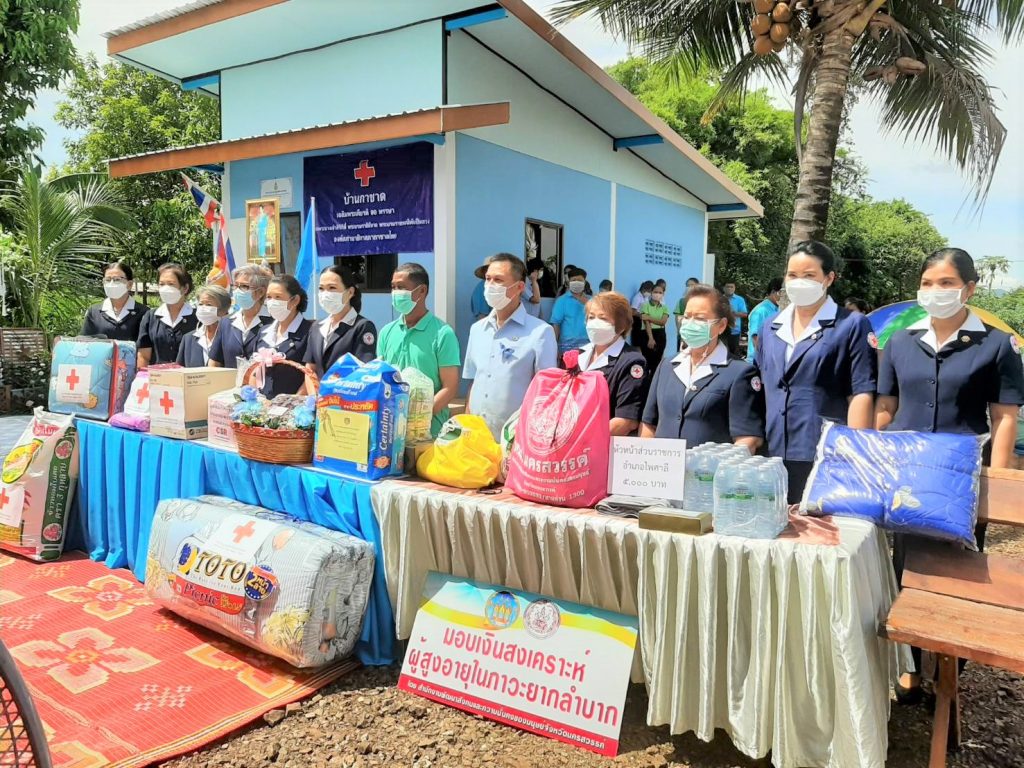 ในการนี้ เหล่ากาชาดจังหวัด กรรมการและสมาชิกเหล่ากาชาดจังหวัด ได้ร่วมบริจาคอุปกรณ์ สิ่งของเครื่องใช้จำเป็น ได้แก่ ถุงธารน้ำใจ ที่นอน หมอนมุ้ง ผ้าห่มนวม ข้าวสาร 45 กก. หม้อหุงข้าวไฟฟ้า พัดลมตั้งโต๊ะพร้อมปลั๊กไฟฟ้า ผลิตภัณฑ์นมยูเอชที และผ้าปูยางพาราอเนกประสงค์ อีกทั้งหน่วยงานพัฒนาสังคมและความมั่นคงของมนุษย์จังหวัด พัฒนาชุมชนจังหวัด ส่วนราชการต่างๆ ได้ร่วมมอบเงินสงเคราะห์แลเครื่องอุปโภค บริโภค สิ่งของ เพื่อบรรเทาความเดือดร้อน เป็นกำลังใจในการดำเนินชีวิต และแสดงความยินดีในโอกาสขึ้นบ้านใหม่
