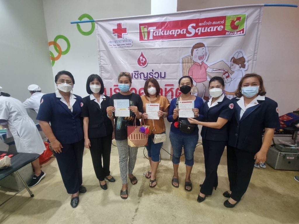วันที่ 12 กรกฎาคม 2565 นางวิภาดา ทิพญพงศ์ธาดา นายกเหล่ากาชาดจังหวัดพังงา มอบหมายให้นางจีรนันท์ สุทพัฒน์แก้ว รองนายกเหล่ากาชาดจังหวัดพังงา พร้อมด้วยกรรมการและสมาชิกเหล่ากาชาดจังหวัดพังงา ร่วมกับภาคบริการโลหิตแห่งชาติจังหวัดภูเก็ต รับบริจาคโลหิต โครงการ Plus 1 ครั้ง เพิ่มโลหิต เพิ่มชีวิต ยอดผู้บริจาค จำนวน 26 ราย โลหิตที่ได้ 10,400ซี.ซี ผู้บริจาคดวงตา จำนวน 13 ราย ผู้บริจาคอวัยวะ จำนวน 12 ราย ณ ศูนย์การค้าตะกั่วป่าสแควร์ อำเภอตะกั่วป่า จังหวัดพังงา