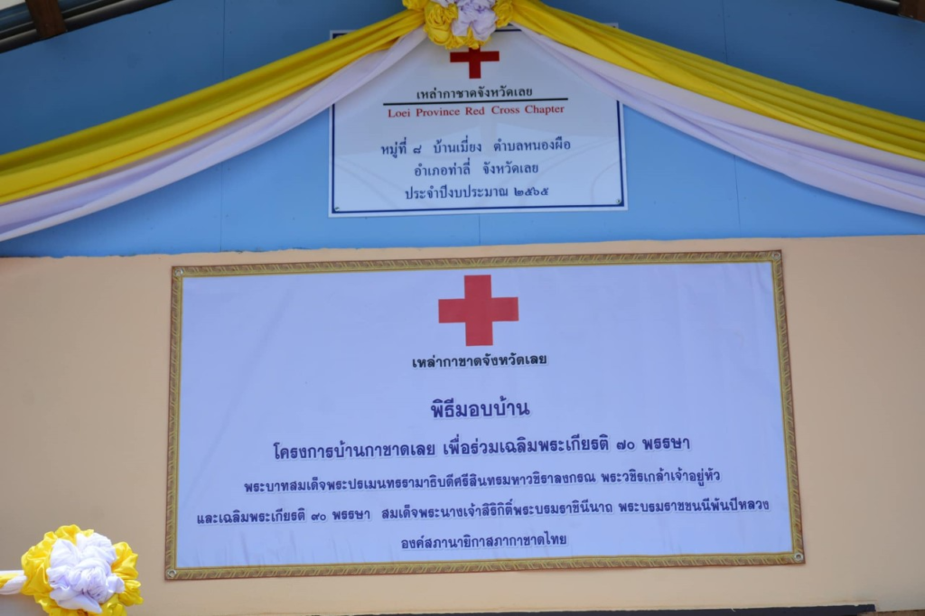 วันที่ 9 สิงหาคม 2565 นางนงค์นิตย์ เนียมศิริ นายกเหล่ากาชาดจังหวัดเลย เป็นประธาน มอบบ้านตามโครงการบ้านกาชาดเลย เพื่อร่วมเฉลิมพระเกียรติ 70 พรรษา พระบาทสมเด็จพระปรเมนทรรามาธิบดีศรีสินทรมหาวชิราลงกรณ พระวชิรเกล้าเจ้าอยู่หัว และเฉลิมพระเกียรติ 90 พรรษา สมเด็จพระนางเจ้าสิริกิต์พระบรมราชินีนาถ พระบรมราชชนนีพันปีหลวง องค์สภานายิกาสภากาชาดไทย ได้ก่อสร้างบ้านให้กับผู้ยากไร้ จำนวน 13 หลัง และซ่อมแซมปรับปรุงบ้าน จำนวน 4 หลัง 14 อำเภอ จังหวัดเลย ในพื้นที่อำเภอท่าลี่ มอบบ้านกาชาดเลย (หลังที่3) ให้แก่ นางหนูทองมา ภารบุญ อยู่บ้านเลขที่ 140 ม.8 ต.หนองผือ อ.ท่าลี่ จ.เลย พร้อมมอบถุงเครื่องอุปโภค บริโภค ที่นอน หมอน หม้อหุงข้าว มุ้ง ผ้าห่ม สิ่งของที่จำเป็น ให้แก่ครอบครัวดังกล่าว มีนายพิสิษฐ์ชัย อภัยปิยกุล นายอำเภอท่าลี่ กล่าวรายงาน พร้อมด้วยนางขนิษฐา พินิจพานิชย์ รองนายกเหล่ากาชาดจังหวัดเลย เหรัญญิกเหล่ากาชาดจังหวัดเลย กรรมการเหล่ากาชาดจังหวัดเลย หัวหน้าส่วนราชการ ชมรมแม่บ้านมหาดไทยจังหวัดเลย ผู้นำท้องถิ่น ประชาชน จิตอาสา ร่วมพิธีในครั้งนี้ โดยเหล่ากาชาดจังหวัดเลย ได้มอบเงิน จำนวน 100,000 บาท ให้กับอำเภอท่าลี่ ดำเนินการก่อสร้างบ้านกาชาดเลย โดยได้รับความร่วมมือจากภาคส่วนราชการ ฝ่ายปกครอง องค์กรปกครองส่วนท้องถิ่น ประชาชนจิตอาสา ได้ร่วมกันก่อสร้างบ้านกาชาดเลย หลังนี้