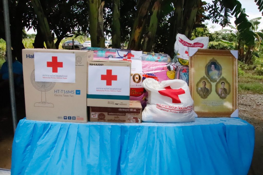 ในการการนี้ เหล่ากาชาดจังหวัดฯ กรรมการและสมาชิกเหล่ากาชาดจังหวัด ได้ร่วมบริจาคอุปกรณ์ สิ่งของเครื่องใช้จำเป็น ได้แก่ ถุงธารน้ำใจ ที่นอน หมอน มุ้ง ผ้าห่มนวม ข้าวสาร 45 กก. หม้อหุงข้าวไฟฟ้า พัดลมตั้งโต๊ะ ผลิตภัณฑ์นมพร้อมดื่ม และผ้าปูยางพาราอเนกประสงค์ รวมมูลค่า 4,600 บาท อีกทั้งหน่วยงานพัฒนาสังคมและความมั่นคงของมนุษย์จังหวัดฯ ส่วนราชการต่างๆ ได้ร่วมมอบเครื่องอุปโภค บริโภค สิ่งของ เพื่อเป็นกำลังใจในการดำเนินชีวิต บรรเทาความเดือดร้อน และแสดงความยินดีในโอกาสได้รับบ้านที่ได้รับการซ่อมแซมและปรับปรุงใหม่