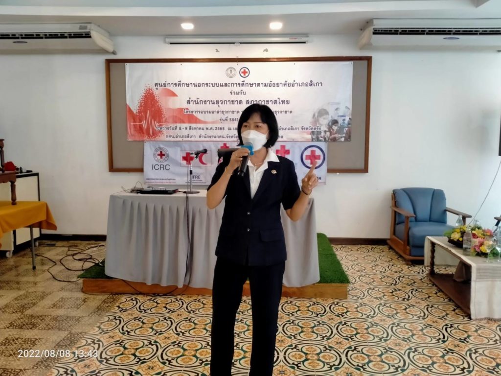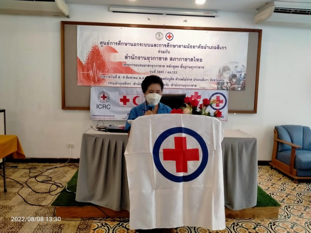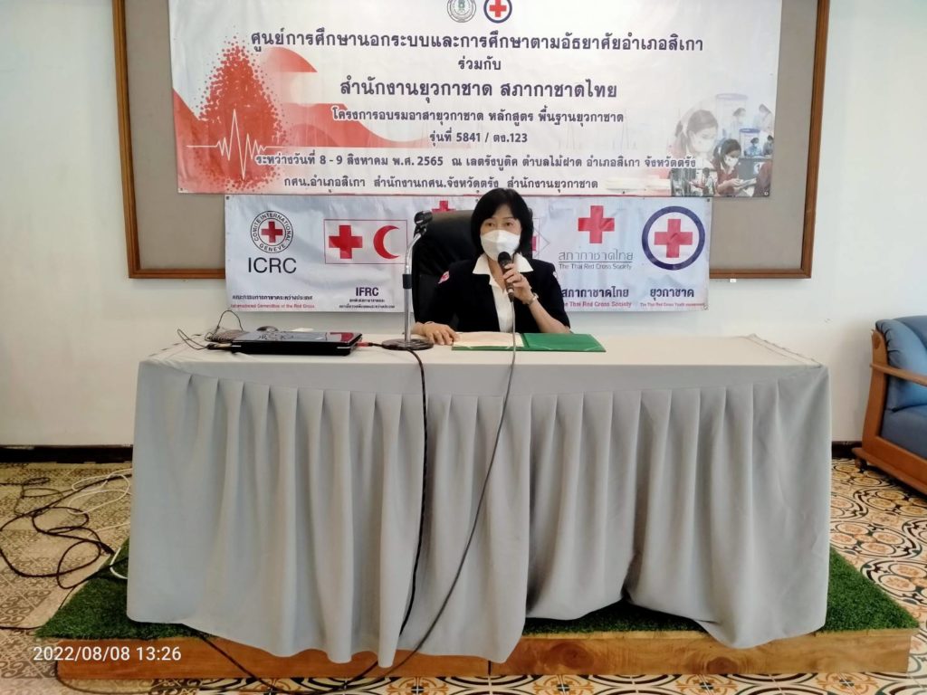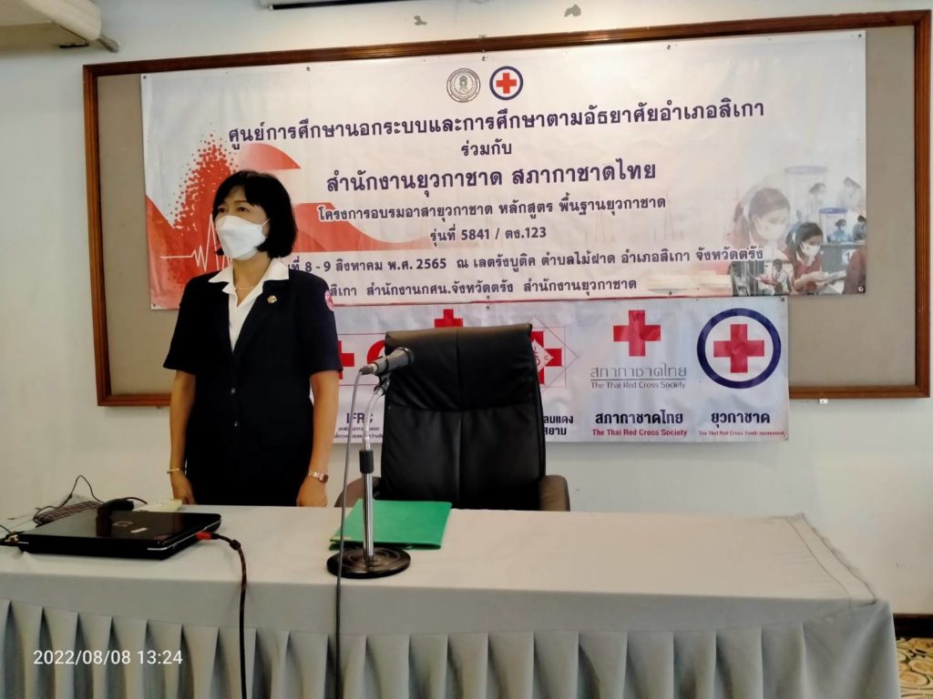 วันที่ 8 สิงหาคม 2565 นางละมัย เจริญโสภา นายกเหล่ากาชาดจังหวัดตรัง มอบหมายให้นางลักษณาพร อนันต์วรปัญญา รองนายกเหล่ากาชาดตรัง เป็นประธานในพิธีเปิดโครงการอบรมอาสายุวกาชาด หลักสูตร พื้นฐานยุวกาชาด รุ่น5841/ตง.123 ซึ่งศูนย์การศึกษานอกระบบและการศึกษาตามอัธยาศัยอำเภอสิเกา(กศน.อำเภอสิเกา) จัดขึ้นระหว่างวันที่ 8-9 สิงหาคม 2565 ณ เลตรังบูติค ตำบลไม้ฝาด อำเภอสิเกา จังหวัดตรัง